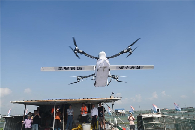 第一篓阳澄湖大闸蟹,由顺丰无人机捞起。开捕节现场,在波光粼粼的湖面上,青背白肚、金爪黄毛的大闸蟹被捕捞上岸。阳澄湖畔,顺丰的冷链车队与无人车整装待发,成为现场最亮眼的 “护航力量”。