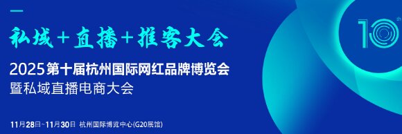 第十届杭州国际网红品牌博览会暨私域直播电商大会将在杭州国际博览中心(G20展馆)盛大开启,开展时间是2025年11月28日至30日,这场展会作为电商行业的年度盛会,有很多值得期待的亮点。