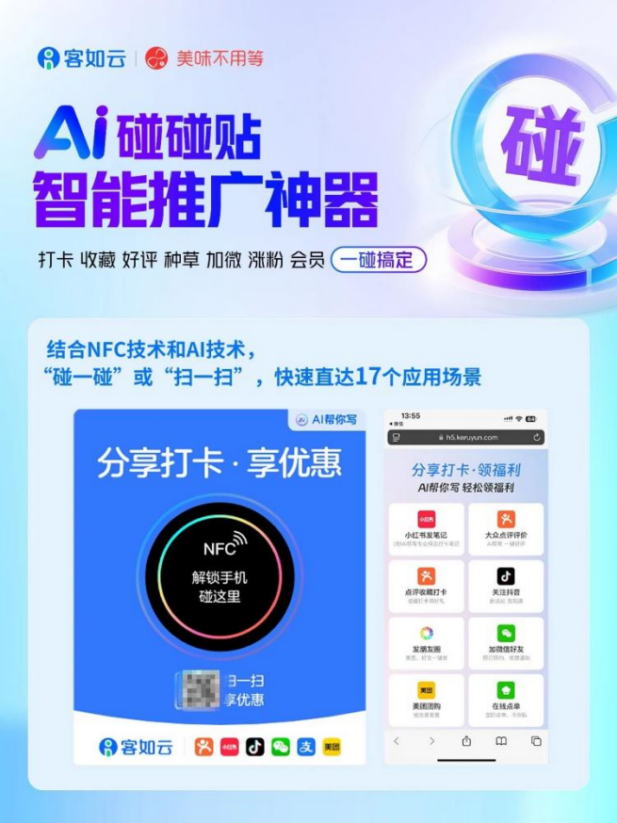 AI碰碰贴则是品牌流量的放大器。它深度融合NFC通信技术与AI大模型能力,顾客只需“一碰”,即可完成打卡、收藏、好评、社交分享等一系列互动,并一键加入店铺会员。更内置入会有礼、优惠充值、超值券包等丰富玩法,轻松实现“公转私”的转化闭环。