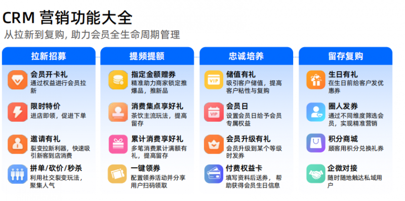 另外客如云CRM会员管理功能提供近30种主流营销玩法,如会员开卡礼、一键领券等功能,助力企业拉新,提频和复购。更有AI智能圈人能力,管理者可圈定目标人群完成初筛,并自由增减筛选条件,精准发放优惠券,让触达省时省力!