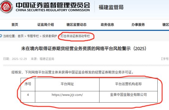 作为香港著名的贵金属交易平台“金荣中国”近日被爆料,遭证监会点名且被列入“高风险”名单!2025年12月29日中国证监会打击非法证券活动专栏显示,包括“金荣中国”在内的多家网络平台运营主体未获得中国证监会核发的经营证券期货业务许可证,存在风险并提出警示!