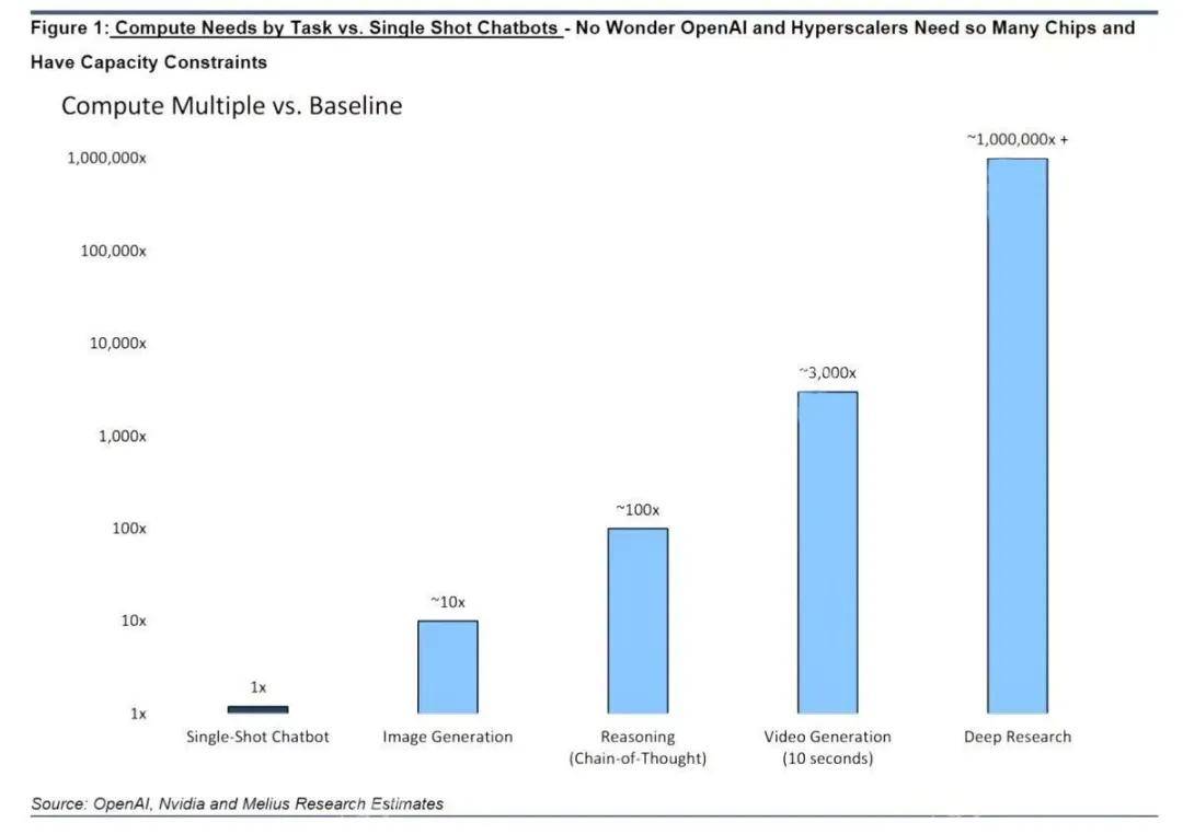 据权威机构预测,如果普通Chatbot类AI工具(文字对话窗口类)对算力需求为1x,那图像生成类相当于10x(10倍),长思考模型相当于100x,视频生成模型大概3000x,Deep Research类相当于10万倍,而AI Agent正处于爆发前夜,智算需求更是不可估量。