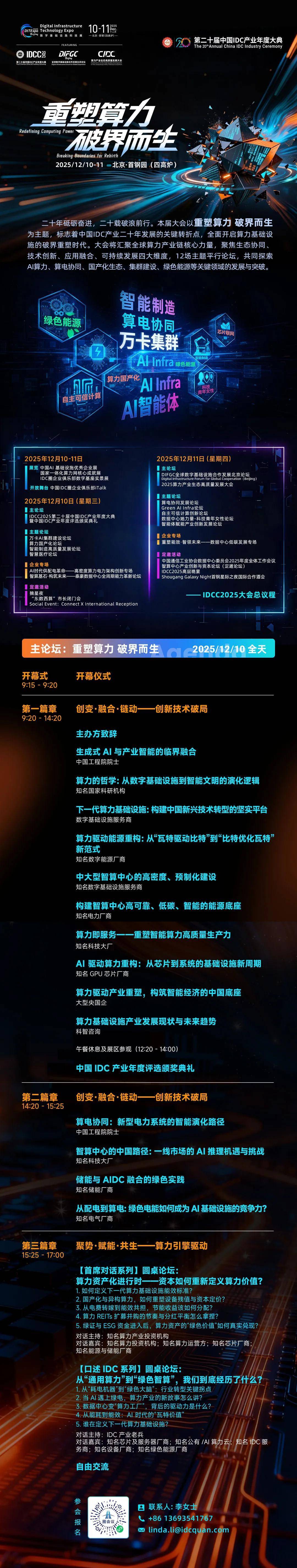 正是在这样的契机下,第二十届中国IDC产业年度大典(IDCC2025)暨数字基础设施科技展(DITExpo)将于12月10日到11日在北京首钢园正式召开,届时将有超过15场平行论坛同期举行,包括DIFGC全球数字基础设施合作发展北京论坛、2025算力产业生态高质量发展大会、万卡AI集群建设论坛、算力国产化论坛、智能制造高质量发展论坛、智慧医疗论坛、算电协同发展论坛、Green AI Infra论坛、自主可信计算创新论坛、数据中心她力量-科技青年女性论坛、智能体赋能产业创新发展论坛、智算中心产业创新与资本论坛(定邀论坛)、中国通信工业协会数据中心委员会2025年度全体工作会议、重塑能效·智领未来——数据中心低碳发展专场、AI时代供配电革命——高密度算力电力架构创新专场、智算基石·构筑未来——泰豪数据中心全周期能力革新论坛。