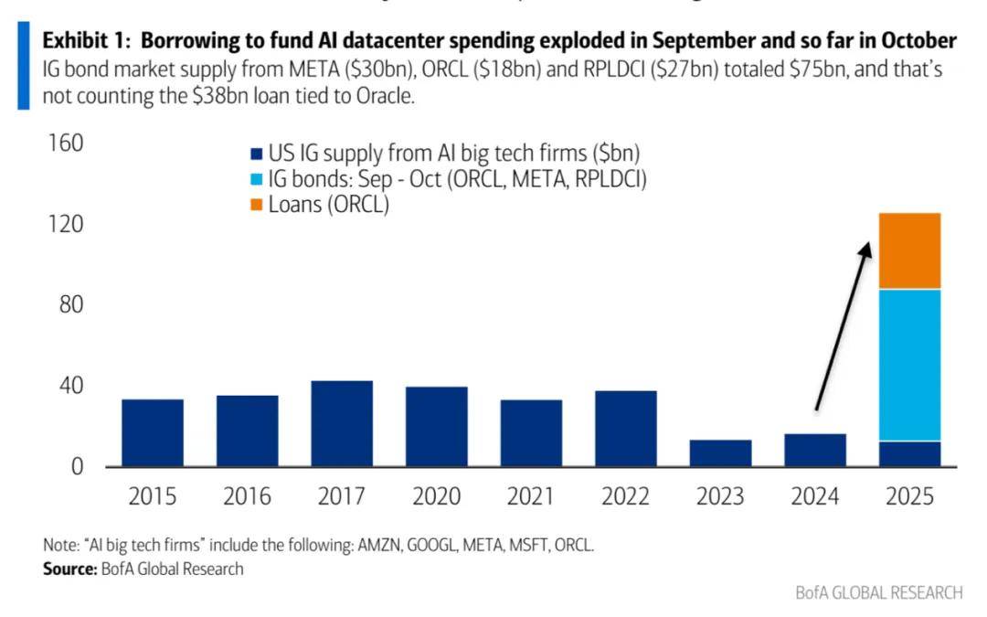 所以很多超大规模云厂商深谙这样的道理:不提前锁定算力,三年后就失去竞争席位。这解释了为何单笔订单动辄数百上千亿美元——这是为未来5年模型迭代预留的战略资源。这也是北美为什么9月和10月至今,用于资助AI数据中心支出的借贷呈现爆炸式增长,2025年的数据中心投资出现跳涨的真实逻辑: