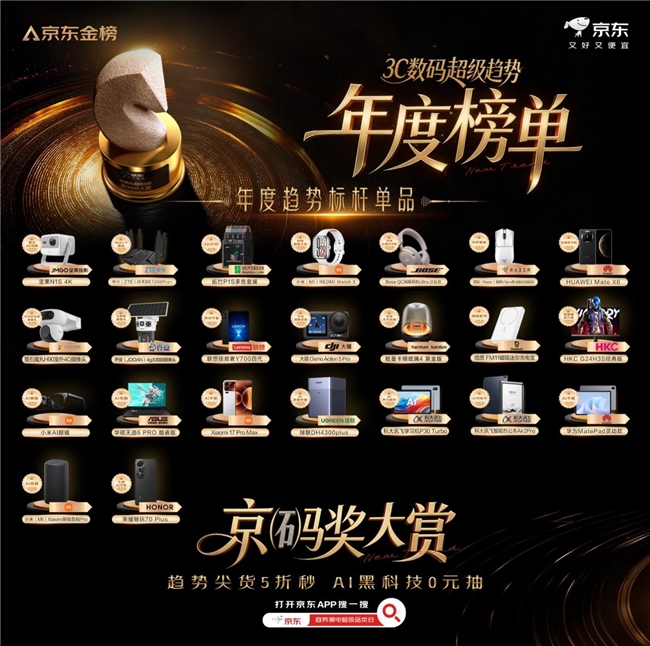 京东还隆重揭晓了“京码奖大赏”年度榜单,从海量产品与品牌中遴选出一批深刻契合年度趋势、并赢得市场与用户双重认可的标杆力量。本次3C数码超级趋势年度奖项联合京东金榜评选而成,京东金榜作为消费者认知度、使用体验和购买满意度显著领先行业的权威榜单,依托销售、口碑等动态数据构建严苛评选体系,更体现出获奖单品与品牌的趋势引领作用。
