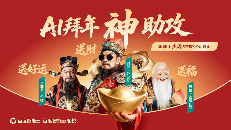 2月10日,百度智能云正式上线财神赵公明、寿星南极仙翁、文曲星包拯三大神仙数字员工,面向公众免费开放。其中,财神赵公明数字员工,由百度智能云与峨眉文旅官方联合打造。