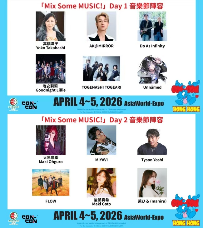 「MixSomeMUSIC!」音乐节将汇集多位殿堂及人气歌手、乐队及表演者,将一连两日为大家热血高歌!包括《新世纪福音战士》主题曲〈残酷天使的行动纲领〉主唱歌手高桥洋子睽违7年后再度来港、曾演唱动画《男儿当入樽》歌曲〈我只凝望你〉的女歌手大黑摩季、曾参与内地综艺节目《披荆斩棘的哥哥》的视觉系摇滚歌手MIYAVI、女团「Morning娘」前成员后藤真希、多次为著名动画《火影忍者》演唱主题曲的人气摇滚乐团FLOW、风靡全球摇滚双人组DoAsInfinity等音乐单位连番献唱。