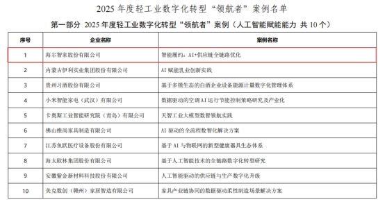 现场,中国轻工业信息中心发布了2025年度轻工业数字化转型“领航者”案例名单,海尔智家凭“智能履约:AI+供应链全链路优化”上榜,并位居人工智能赋能方向榜首。